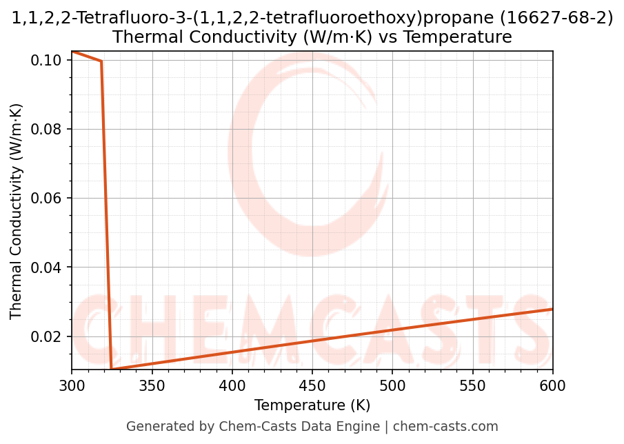 This page presents the temperature-dependent thermodynamic and transport properties of 1,1,2,2-Tetrafluoro-3-(1,1,2,2-tetrafluoroethoxy)propane (CAS 16627-68-2) calculated at a constant pressure of 1 atm (101325 Pa) over the temperature range 250-500 K.