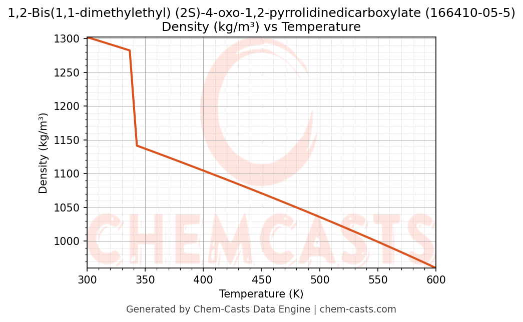 This page presents the temperature-dependent thermodynamic and transport properties of 1,2-Bis(1,1-dimethylethyl) (2S)-4-oxo-1,2-pyrrolidinedicarboxylate (CAS 166410-05-5) calculated at a constant pressure of 1 atm (101325 Pa) over the temperature range 250-500 K.