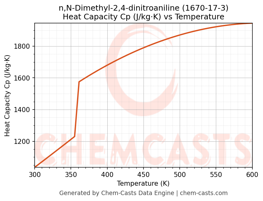 - Specific heat capacity (Cp) indicates the amount of energy required to raise the temperature of n,N-Dimethyl-2,4-dinitroaniline and is critical for energy balance and heat-exchanger design.