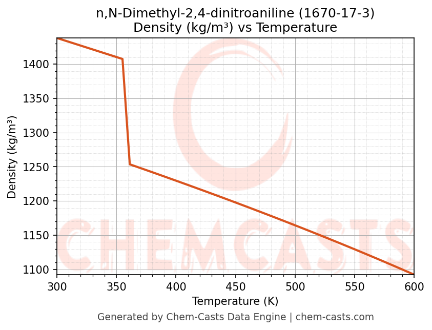 This page presents the temperature-dependent thermodynamic and transport properties of n,N-Dimethyl-2,4-dinitroaniline (CAS 1670-17-3) calculated at a constant pressure of 1 atm (101325 Pa) over the temperature range 250-500 K.