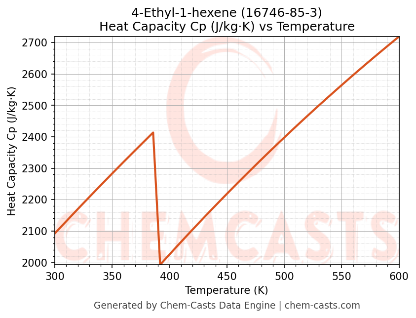 - Specific heat capacity (Cp) indicates the amount of energy required to raise the temperature of 4-Ethyl-1-hexene and is critical for energy balance and heat-exchanger design.