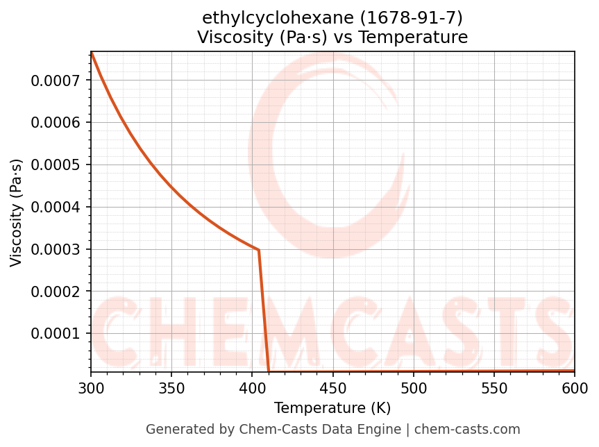 This page presents the temperature-dependent thermodynamic and transport properties of ethylcyclohexane (CAS 1678-91-7) calculated at a constant pressure of 1 atm (101325 Pa) over the temperature range 250-500 K.