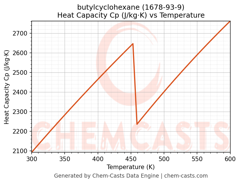 - Specific heat capacity (Cp) indicates the amount of energy required to raise the temperature of butylcyclohexane and is critical for energy balance and heat-exchanger design.