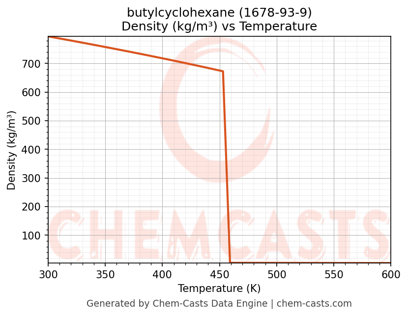 This page presents the temperature-dependent thermodynamic and transport properties of butylcyclohexane (CAS 1678-93-9) calculated at a constant pressure of 1 atm (101325 Pa) over the temperature range 250-500 K.