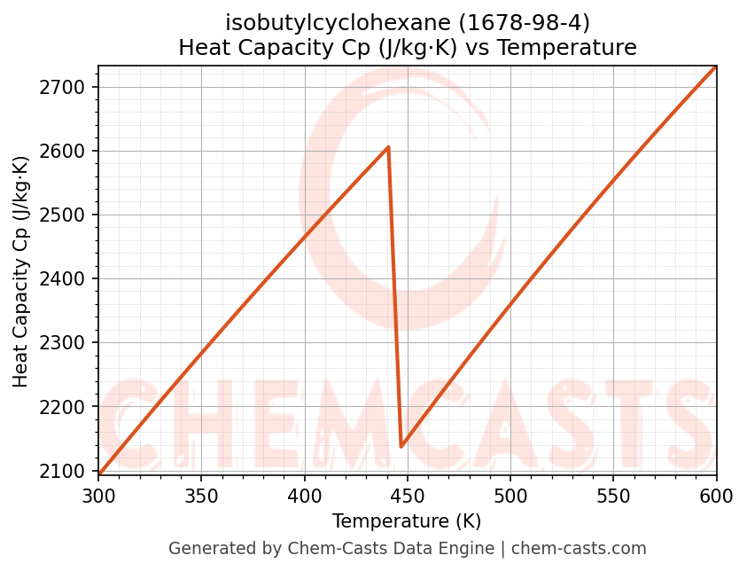 - Specific heat capacity (Cp) indicates the amount of energy required to raise the temperature of isobutylcyclohexane and is critical for energy balance and heat-exchanger design.