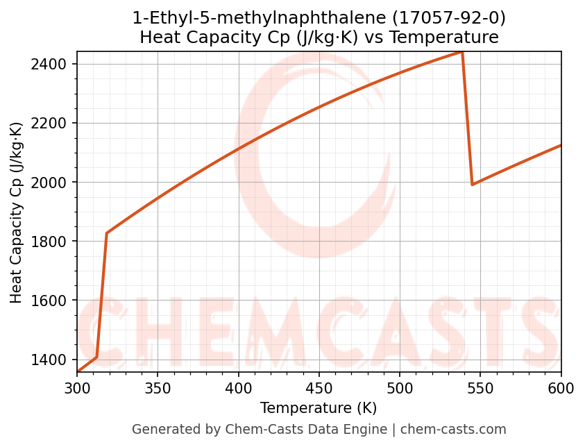 - Specific heat capacity (Cp) indicates the amount of energy required to raise the temperature of 1-Ethyl-5-methylnaphthalene and is critical for energy balance and heat-exchanger design.