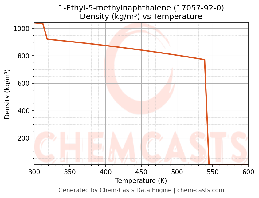 This page presents the temperature-dependent thermodynamic and transport properties of 1-Ethyl-5-methylnaphthalene (CAS 17057-92-0) calculated at a constant pressure of 1 atm (101325 Pa) over the temperature range 250-500 K.