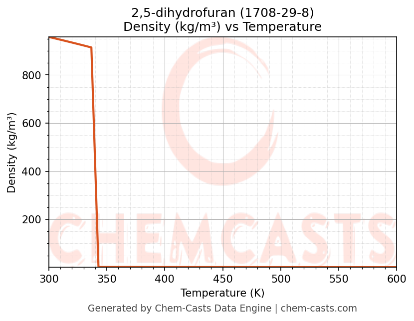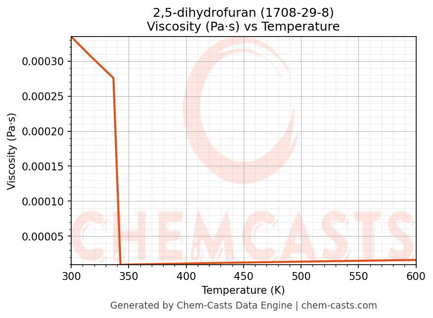 This page presents the temperature-dependent thermodynamic and transport properties of 2,5-dihydrofuran (CAS 1708-29-8) calculated at a constant pressure of 1 atm (101325 Pa) over the temperature range 250-500 K.