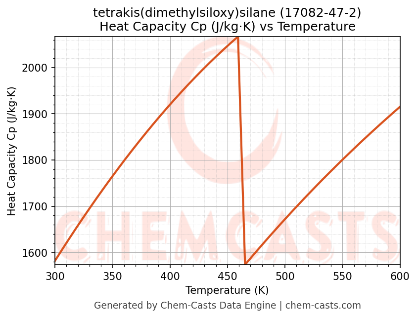 This page presents the temperature-dependent thermodynamic and transport properties of tetrakis(dimethylsiloxy)silane (CAS 17082-47-2) calculated at a constant pressure of 1 atm (101325 Pa) over the temperature range 250-500 K.