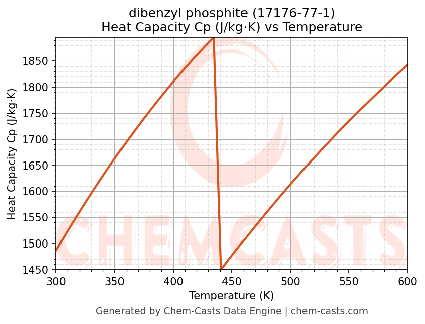 This page presents the temperature-dependent thermodynamic and transport properties of dibenzyl phosphite (CAS 17176-77-1) calculated at a constant pressure of 1 atm (101325 Pa) over the temperature range 250-500 K.