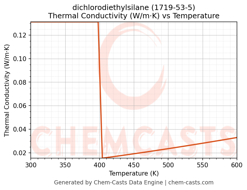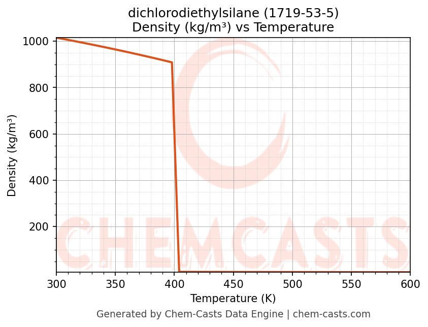This page presents the temperature-dependent thermodynamic and transport properties of dichlorodiethylsilane (CAS 1719-53-5) calculated at a constant pressure of 1 atm (101325 Pa) over the temperature range 250-500 K.