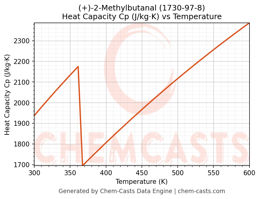 - Specific heat capacity (Cp) indicates the amount of energy required to raise the temperature of (+)-2-Methylbutanal and is critical for energy balance and heat-exchanger design.