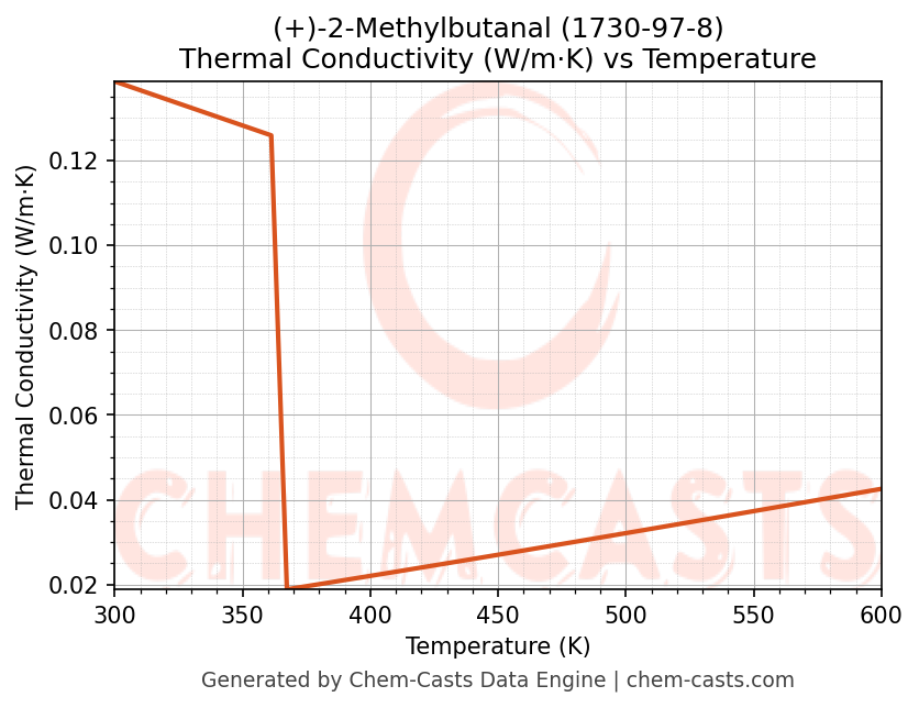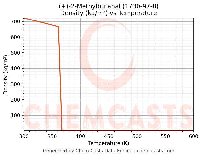This page presents the temperature-dependent thermodynamic and transport properties of (+)-2-Methylbutanal (CAS 1730-97-8) calculated at a constant pressure of 1 atm (101325 Pa) over the temperature range 250-500 K.
