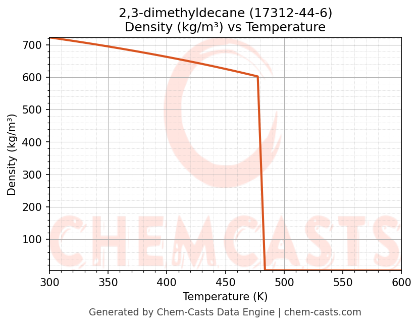 This page presents the temperature-dependent thermodynamic and transport properties of 2,3-dimethyldecane (CAS 17312-44-6) calculated at a constant pressure of 1 atm (101325 Pa) over the temperature range 250-500 K.