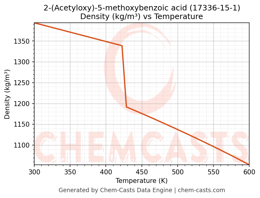 This page presents the temperature-dependent thermodynamic and transport properties of 2-(Acetyloxy)-5-methoxybenzoic acid (CAS 17336-15-1) calculated at a constant pressure of 1 atm (101325 Pa) over the temperature range 250-500 K.