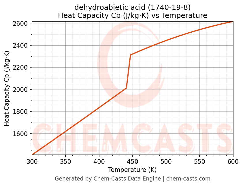 - Specific heat capacity (Cp) indicates the amount of energy required to raise the temperature of dehydroabietic acid and is critical for energy balance and heat-exchanger design.