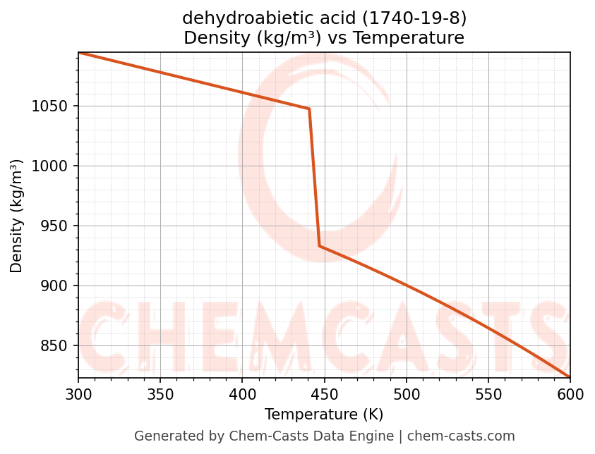 This page presents the temperature-dependent thermodynamic and transport properties of dehydroabietic acid (CAS 1740-19-8) calculated at a constant pressure of 1 atm (101325 Pa) over the temperature range 250-500 K.