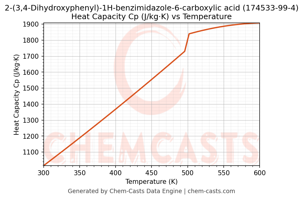 - Specific heat capacity (Cp) indicates the amount of energy required to raise the temperature of 2-(3,4-Dihydroxyphenyl)-1H-benzimidazole-6-carboxylic acid and is critical for energy balance and heat-exchanger design.