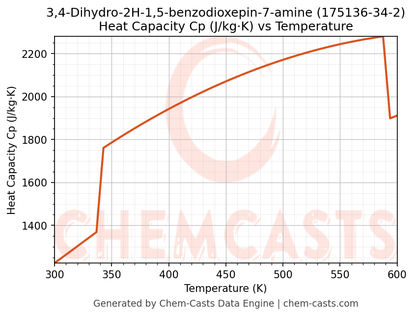 - Specific heat capacity (Cp) indicates the amount of energy required to raise the temperature of 3,4-Dihydro-2H-1,5-benzodioxepin-7-amine and is critical for energy balance and heat-exchanger design.