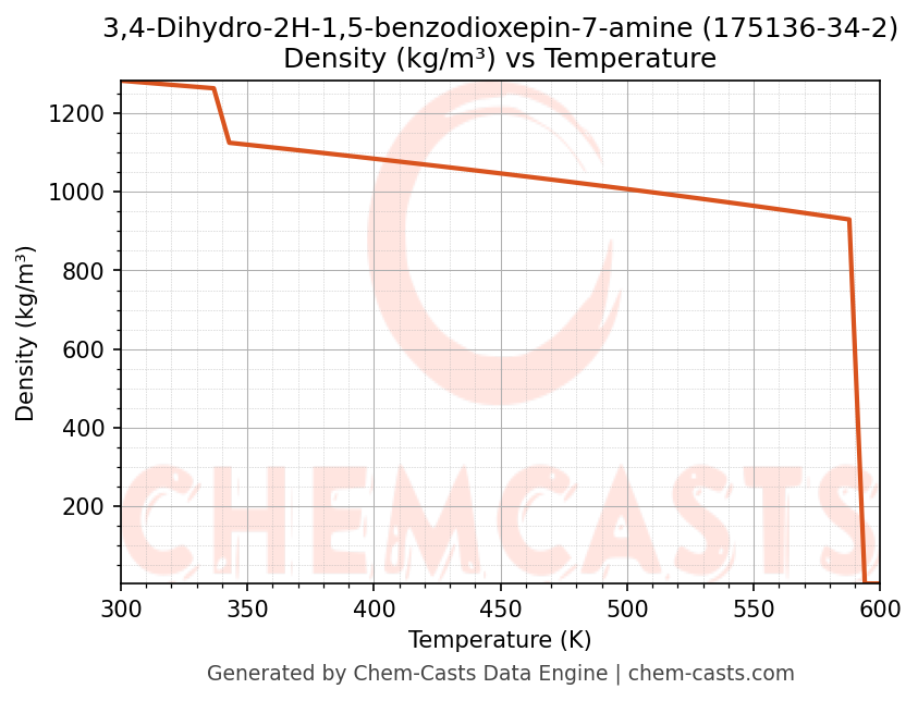 This page presents the temperature-dependent thermodynamic and transport properties of 3,4-Dihydro-2H-1,5-benzodioxepin-7-amine (CAS 175136-34-2) calculated at a constant pressure of 1 atm (101325 Pa) over the temperature range 250-500 K.