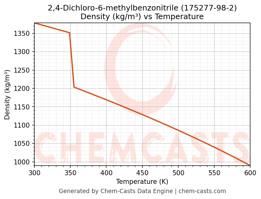 This page presents the temperature-dependent thermodynamic and transport properties of 2,4-Dichloro-6-methylbenzonitrile (CAS 175277-98-2) calculated at a constant pressure of 1 atm (101325 Pa) over the temperature range 250-500 K.