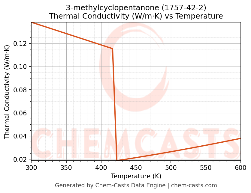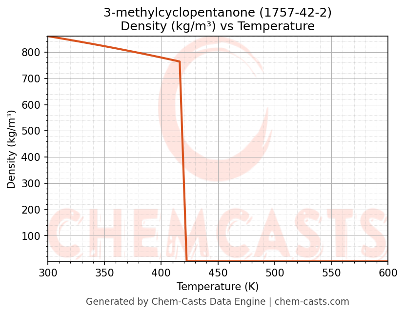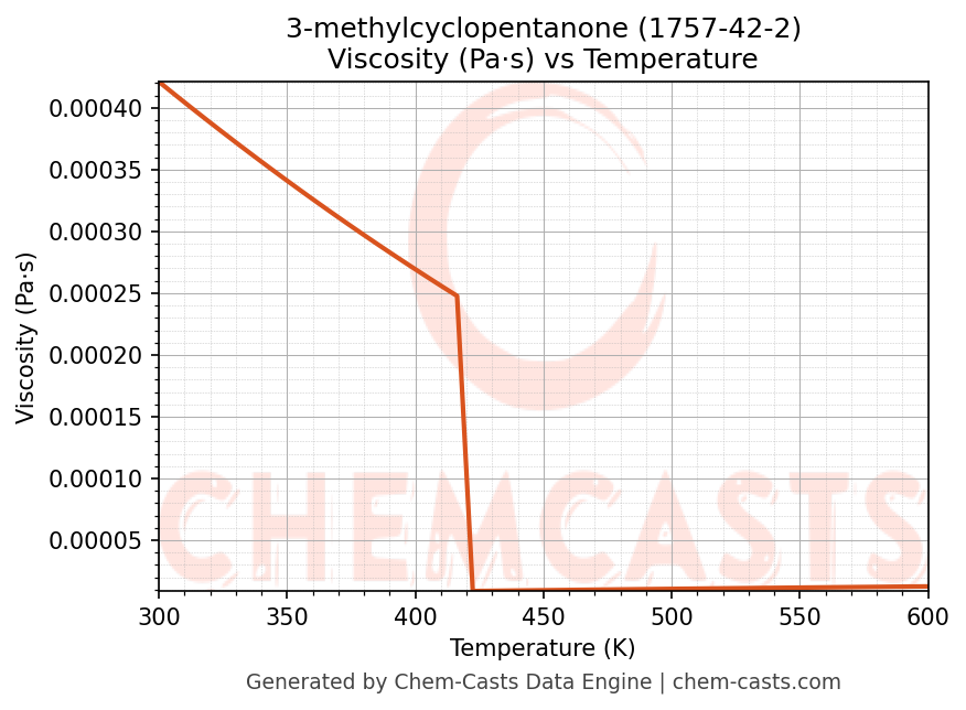 This page presents the temperature-dependent thermodynamic and transport properties of 3-methylcyclopentanone (CAS 1757-42-2) calculated at a constant pressure of 1 atm (101325 Pa) over the temperature range 250-500 K.