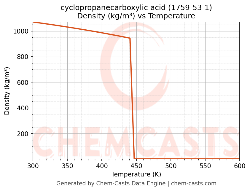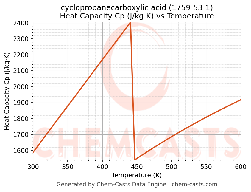 - Specific heat capacity (Cp) indicates the amount of energy required to raise the temperature of cyclopropanecarboxylic acid and is critical for energy balance and heat-exchanger design.