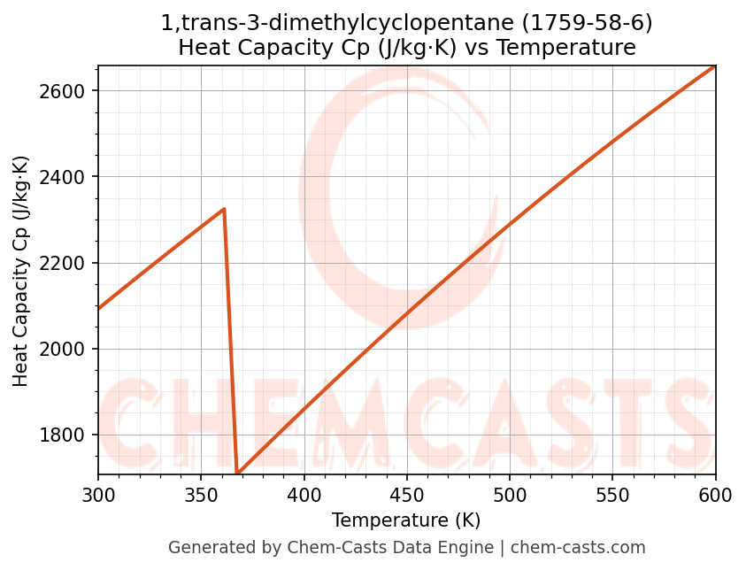 - Specific heat capacity (Cp) indicates the amount of energy required to raise the temperature of 1,trans-3-dimethylcyclopentane and is critical for energy balance and heat-exchanger design.