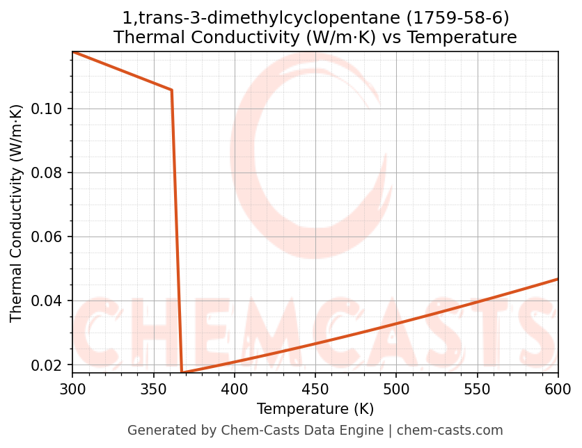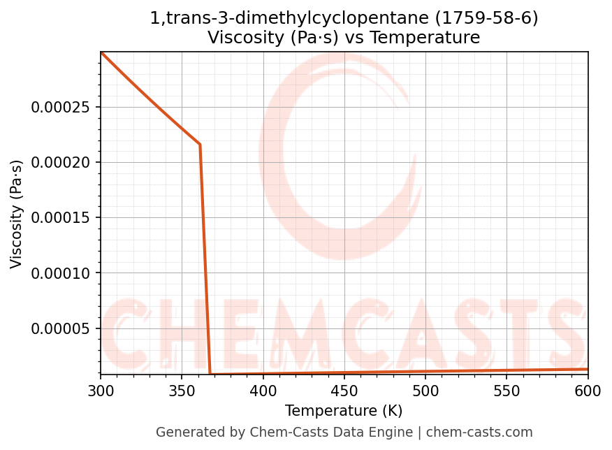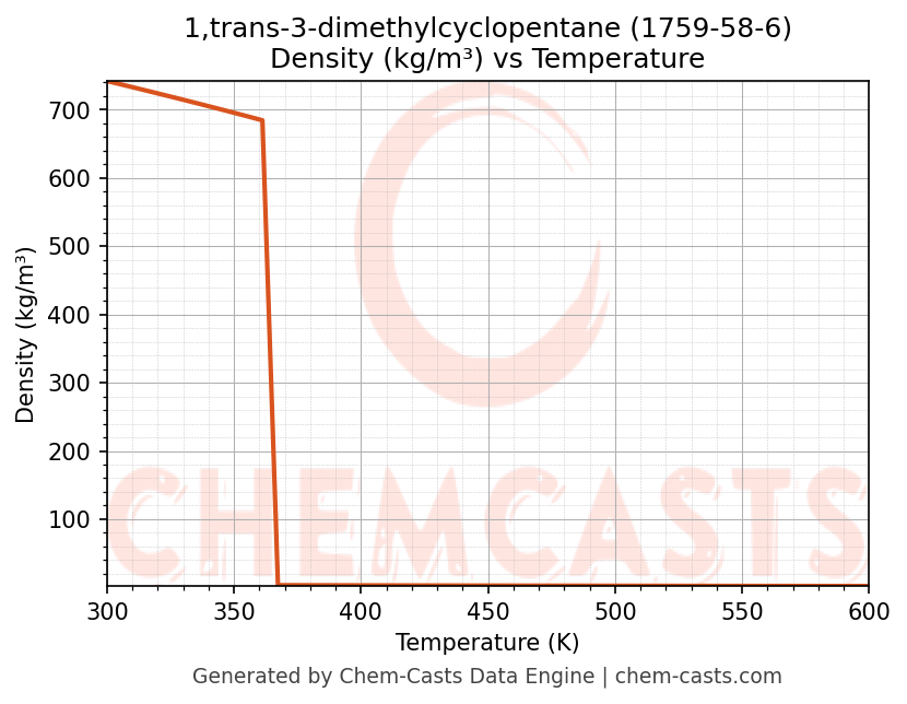 This page presents the temperature-dependent thermodynamic and transport properties of 1,trans-3-dimethylcyclopentane (CAS 1759-58-6) calculated at a constant pressure of 1 atm (101325 Pa) over the temperature range 250-500 K.