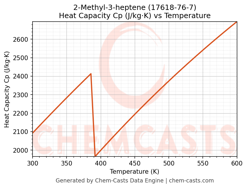 - Specific heat capacity (Cp) indicates the amount of energy required to raise the temperature of 2-Methyl-3-heptene and is critical for energy balance and heat-exchanger design.