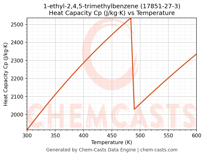 - Specific heat capacity (Cp) indicates the amount of energy required to raise the temperature of 1-ethyl-2,4,5-trimethylbenzene and is critical for energy balance and heat-exchanger design.