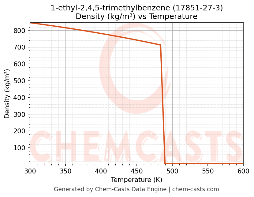 This page presents the temperature-dependent thermodynamic and transport properties of 1-ethyl-2,4,5-trimethylbenzene (CAS 17851-27-3) calculated at a constant pressure of 1 atm (101325 Pa) over the temperature range 250-500 K.