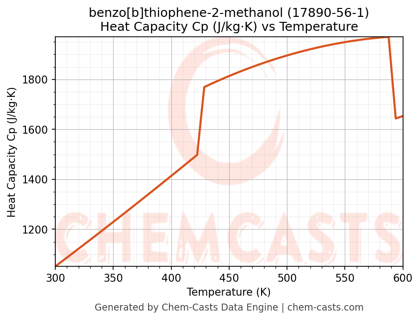 ![Heat Capacity (Cp) vs Temperature chart for benzo[b]thiophene-2-methanol (CAS 17890-56-1)](https://chemcasts-prod.s3.ap-south-1.amazonaws.com/chem_plots_pconst/17890-56-1-cp.png)