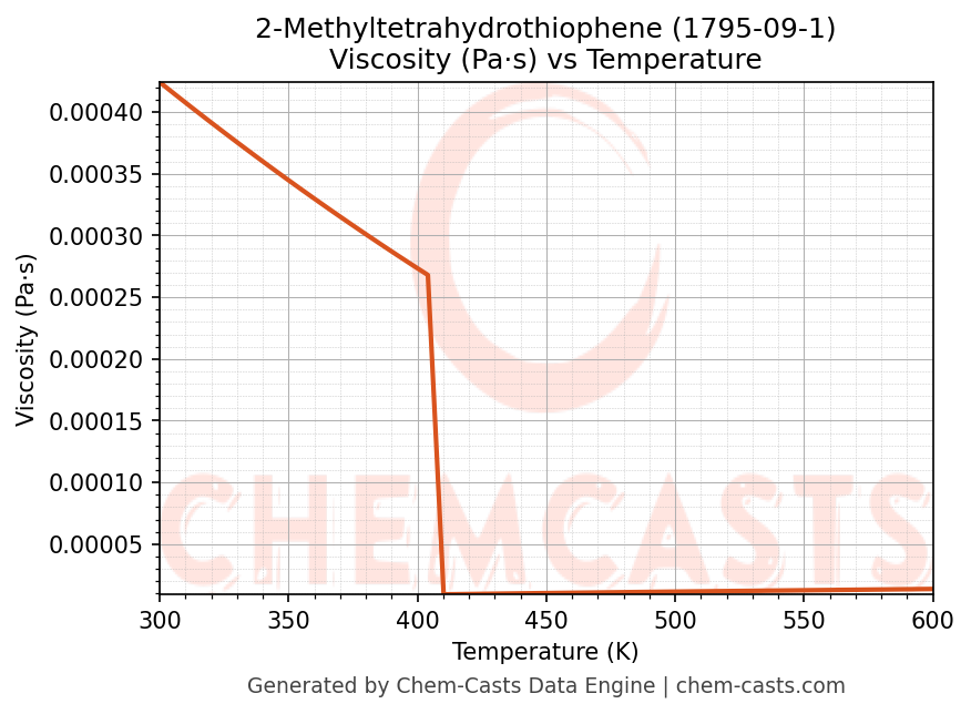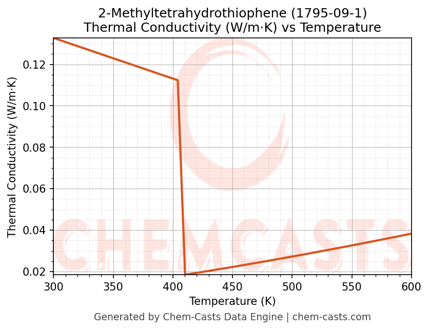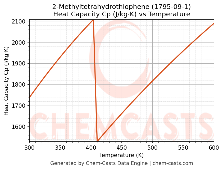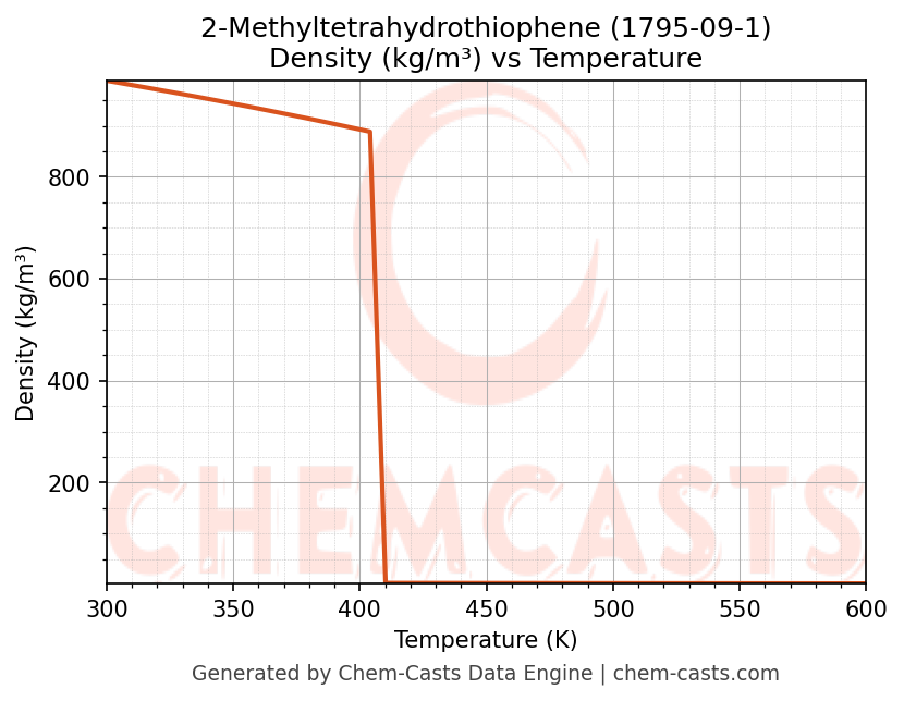 This page presents the temperature-dependent thermodynamic and transport properties of 2-Methyltetrahydrothiophene (CAS 1795-09-1) calculated at a constant pressure of 1 atm (101325 Pa) over the temperature range 250-500 K.
