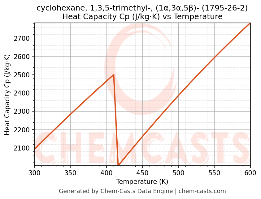 - Specific heat capacity (Cp) indicates the amount of energy required to raise the temperature of cyclohexane, 1,3,5-trimethyl-, (1α,3α,5β)- and is critical for energy balance and heat-exchanger design.