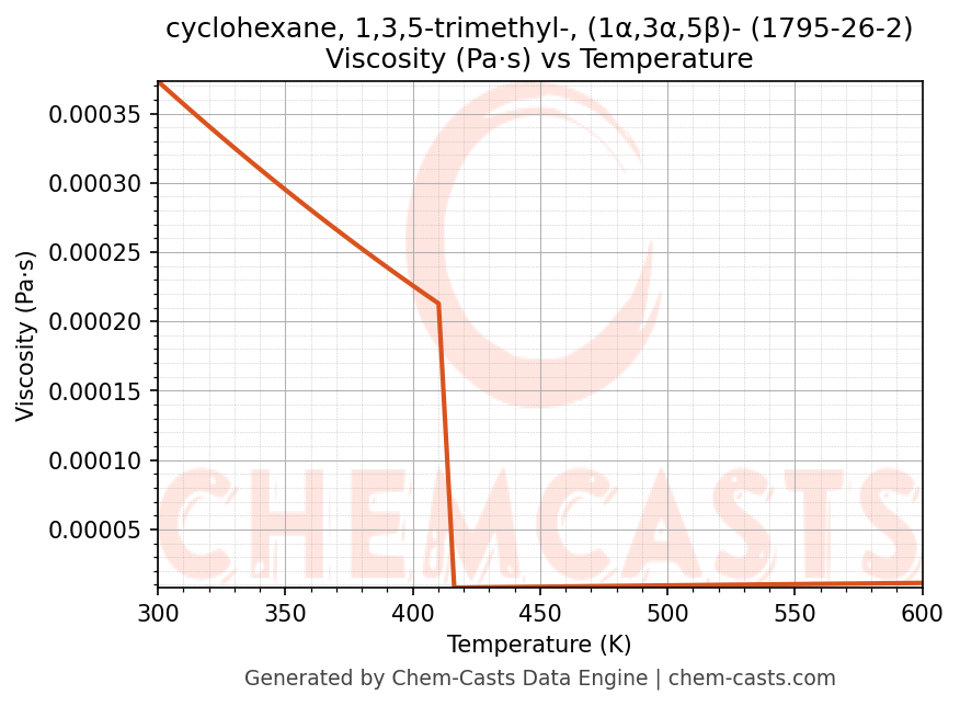 This page presents the temperature-dependent thermodynamic and transport properties of cyclohexane, 1,3,5-trimethyl-, (1α,3α,5β)- (CAS 1795-26-2) calculated at a constant pressure of 1 atm (101325 Pa) over the temperature range 250-500 K.