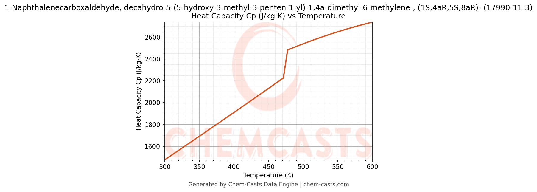 - Specific heat capacity (Cp) indicates the amount of energy required to raise the temperature of 1-Naphthalenecarboxaldehyde, decahydro-5-(5-hydroxy-3-methyl-3-penten-1-yl)-1,4a-dimethyl-6-methylene-, (1S,4aR,5S,8aR)- and is critical for energy balance and heat-exchanger design.