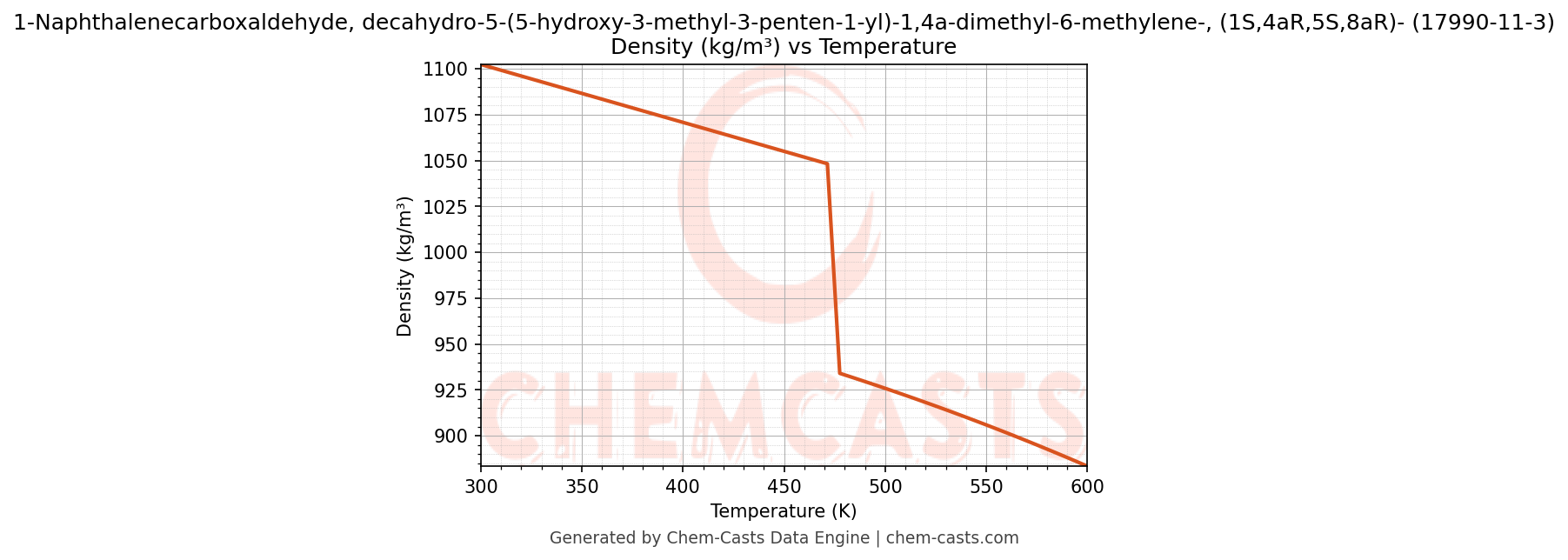 This page presents the temperature-dependent thermodynamic and transport properties of 1-Naphthalenecarboxaldehyde, decahydro-5-(5-hydroxy-3-methyl-3-penten-1-yl)-1,4a-dimethyl-6-methylene-, (1S,4aR,5S,8aR)- (CAS 17990-11-3) calculated at a constant pressure of 1 atm (101325 Pa) over the temperature range 250-500 K.