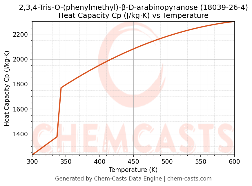 - Specific heat capacity (Cp) indicates the amount of energy required to raise the temperature of 2,3,4-Tris-O-(phenylmethyl)-β-D-arabinopyranose and is critical for energy balance and heat-exchanger design.