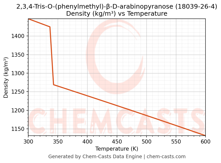 This page presents the temperature-dependent thermodynamic and transport properties of 2,3,4-Tris-O-(phenylmethyl)-β-D-arabinopyranose (CAS 18039-26-4) calculated at a constant pressure of 1 atm (101325 Pa) over the temperature range 250-500 K.
