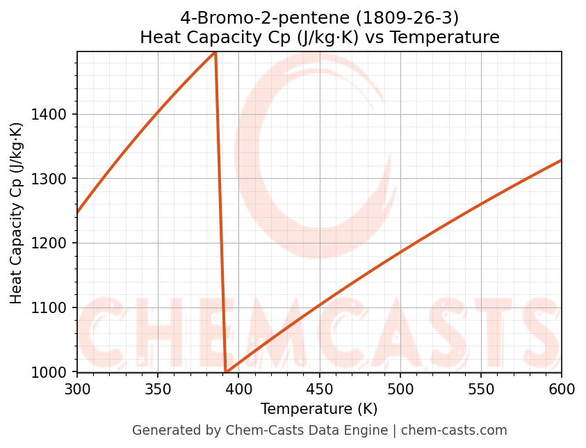 - Specific heat capacity (Cp) indicates the amount of energy required to raise the temperature of 4-Bromo-2-pentene and is critical for energy balance and heat-exchanger design.