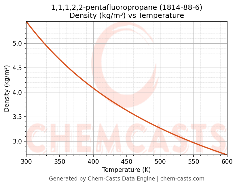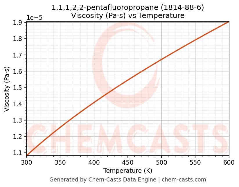 This page presents the temperature-dependent thermodynamic and transport properties of 1,1,1,2,2-pentafluoropropane (CAS 1814-88-6) calculated at a constant pressure of 1 atm (101325 Pa) over the temperature range 250-500 K.