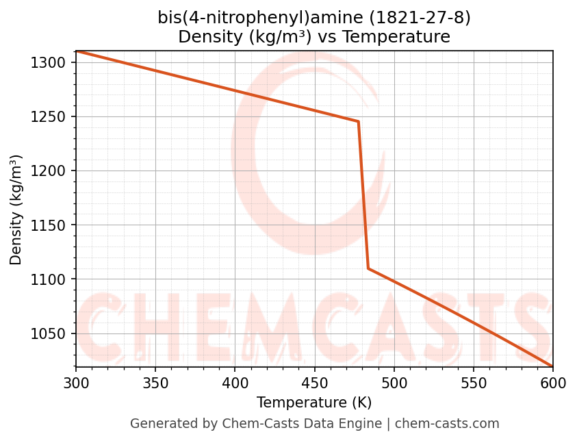 This page presents the temperature-dependent thermodynamic and transport properties of bis(4-nitrophenyl)amine (CAS 1821-27-8) calculated at a constant pressure of 1 atm (101325 Pa) over the temperature range 250-500 K.