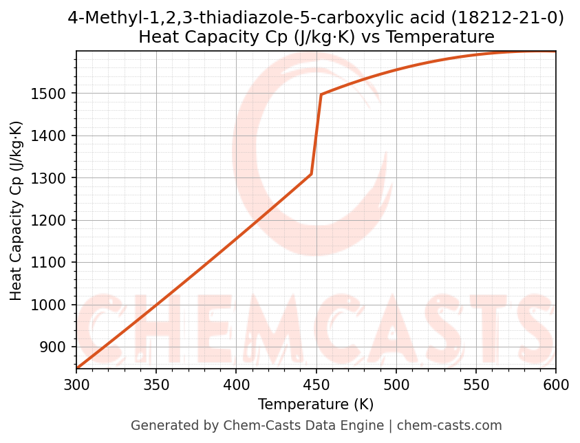 - Specific heat capacity (Cp) indicates the amount of energy required to raise the temperature of 4-Methyl-1,2,3-thiadiazole-5-carboxylic acid and is critical for energy balance and heat-exchanger design.