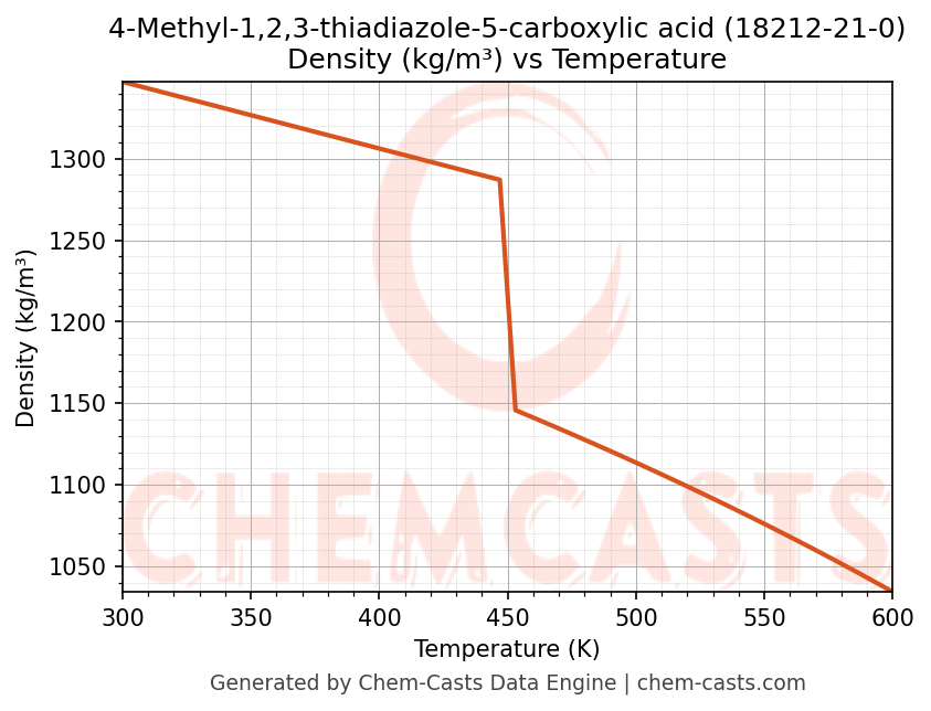 This page presents the temperature-dependent thermodynamic and transport properties of 4-Methyl-1,2,3-thiadiazole-5-carboxylic acid (CAS 18212-21-0) calculated at a constant pressure of 1 atm (101325 Pa) over the temperature range 250-500 K.