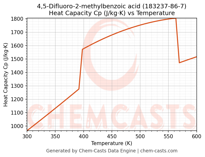 - Specific heat capacity (Cp) indicates the amount of energy required to raise the temperature of 4,5-Difluoro-2-methylbenzoic acid and is critical for energy balance and heat-exchanger design.