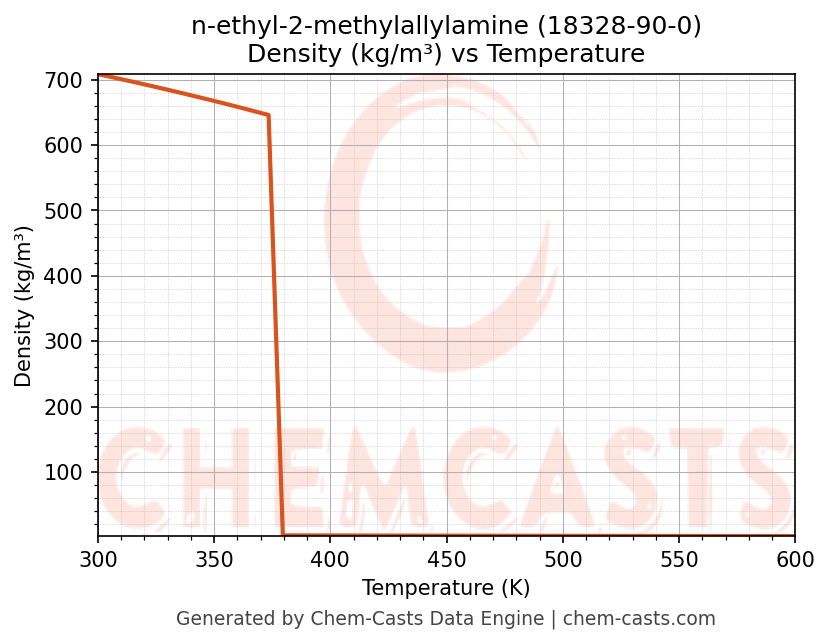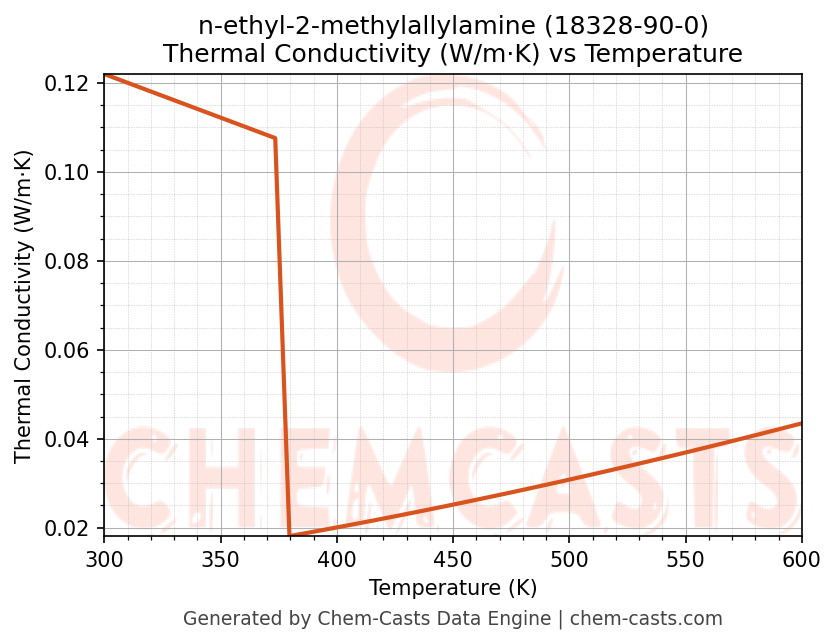 This page presents the temperature-dependent thermodynamic and transport properties of n-ethyl-2-methylallylamine (CAS 18328-90-0) calculated at a constant pressure of 1 atm (101325 Pa) over the temperature range 250-500 K.