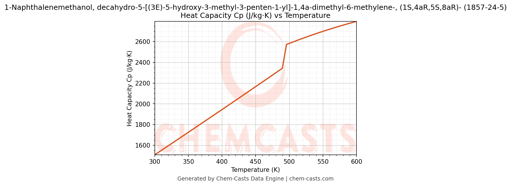 - Specific heat capacity (Cp) indicates the amount of energy required to raise the temperature of 1-Naphthalenemethanol, decahydro-5-[(3E)-5-hydroxy-3-methyl-3-penten-1-yl]-1,4a-dimethyl-6-methylene-, (1S,4aR,5S,8aR)- and is critical for energy balance and heat-exchanger design.
