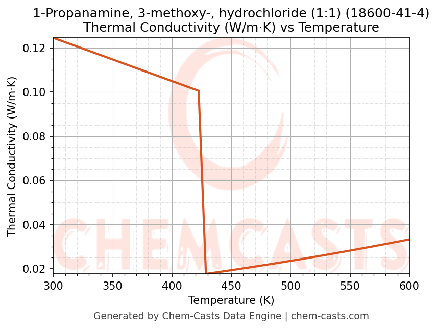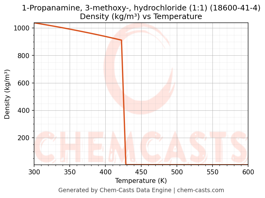 This page presents the temperature-dependent thermodynamic and transport properties of 1-Propanamine, 3-methoxy-, hydrochloride (1:1) (CAS 18600-41-4) calculated at a constant pressure of 1 atm (101325 Pa) over the temperature range 250-500 K.