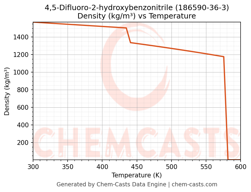 This page presents the temperature-dependent thermodynamic and transport properties of 4,5-Difluoro-2-hydroxybenzonitrile (CAS 186590-36-3) calculated at a constant pressure of 1 atm (101325 Pa) over the temperature range 250-500 K.
